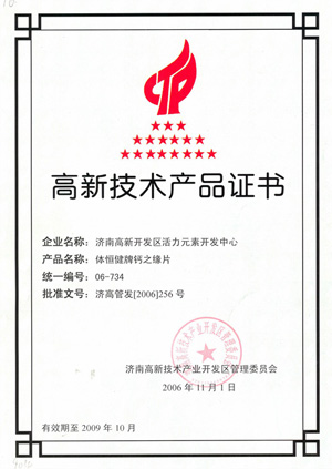 高新技術(shù)產(chǎn)品證書—鈣之緣