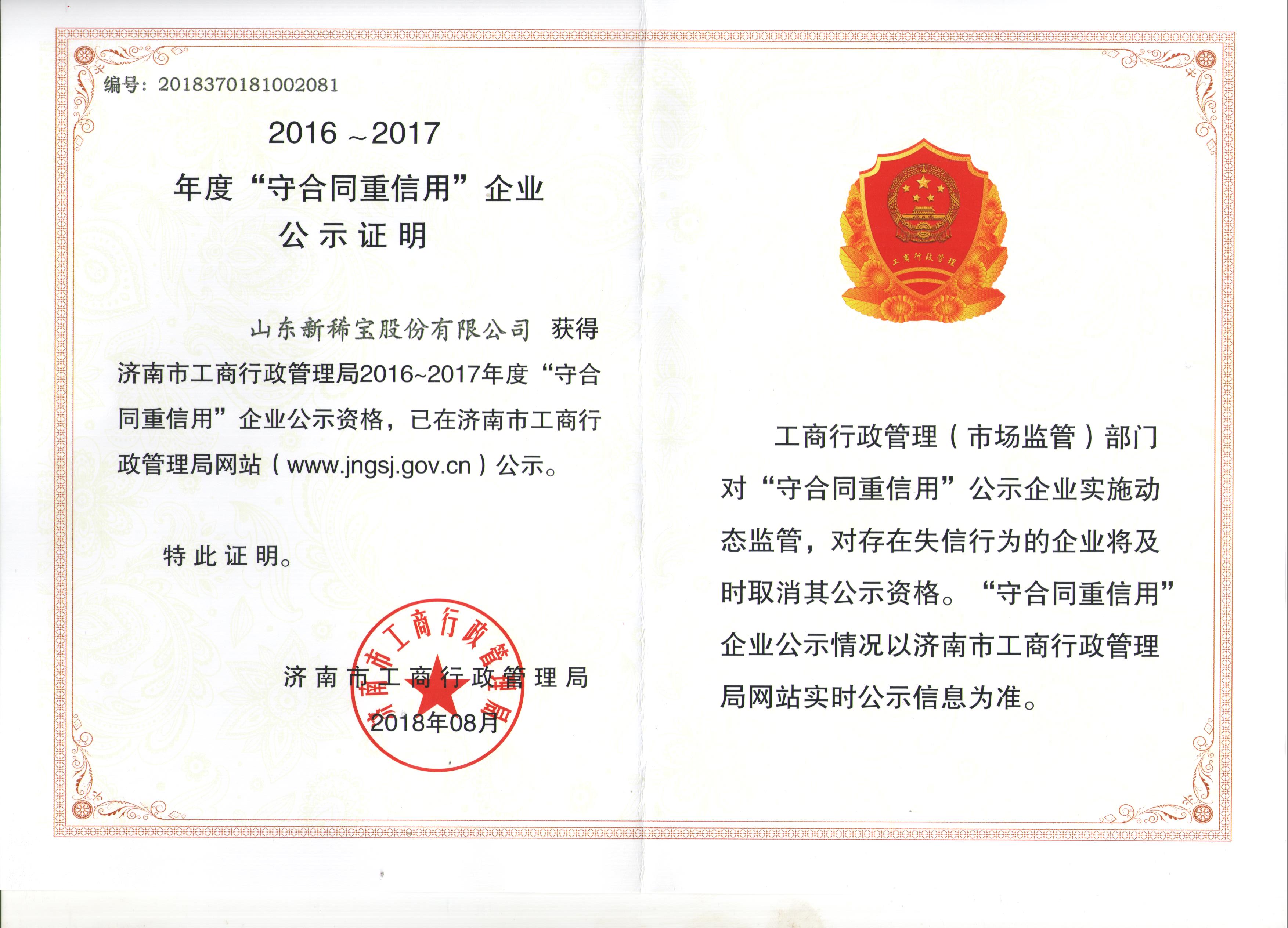 1998年至今,連續(xù)多次被濟南市工商行政管理局認定為“守合同重信用企業(yè)”